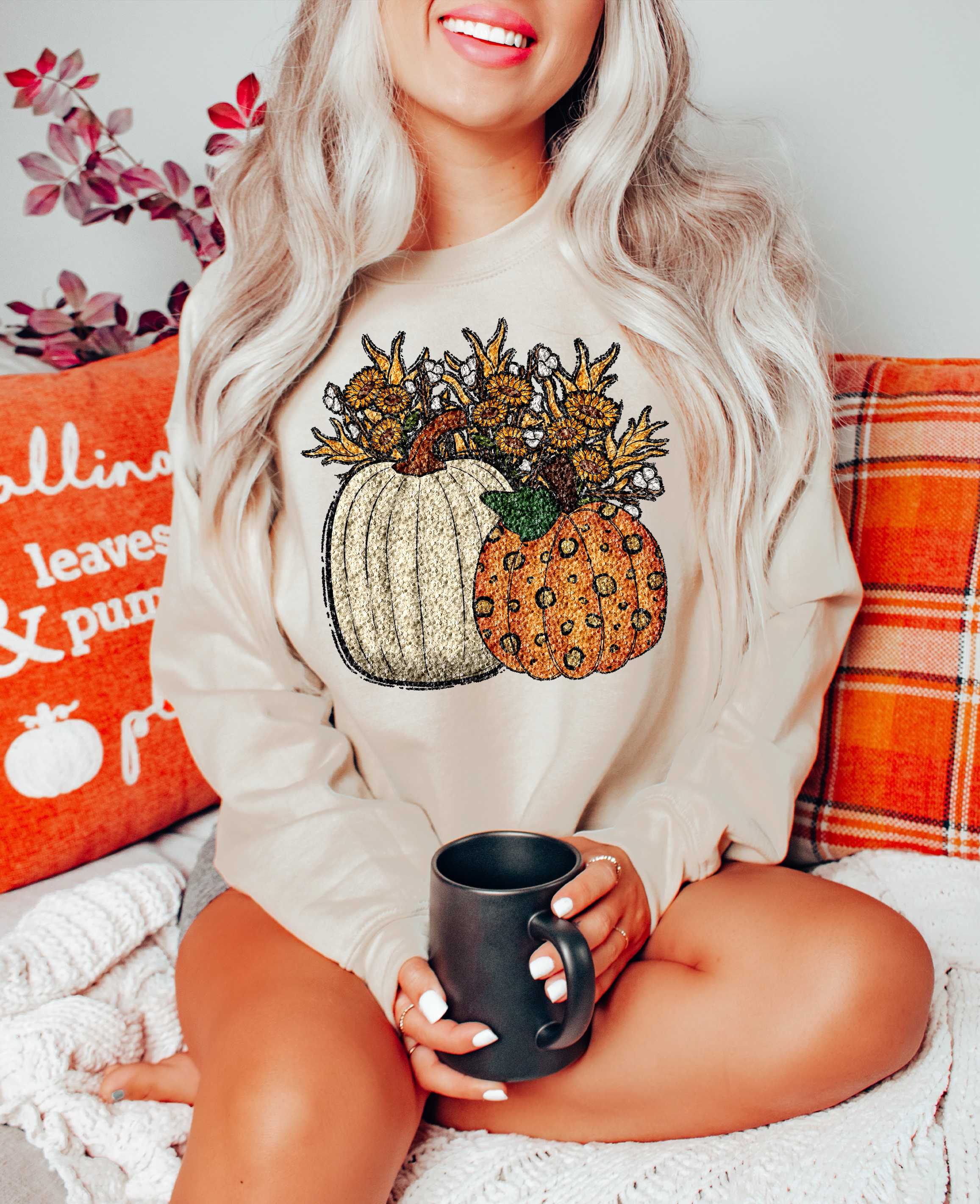 Sequin Effect Pumpkin Flowers Sweatshirt or T-shirt