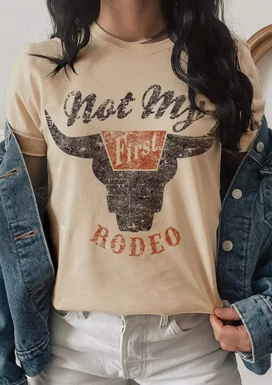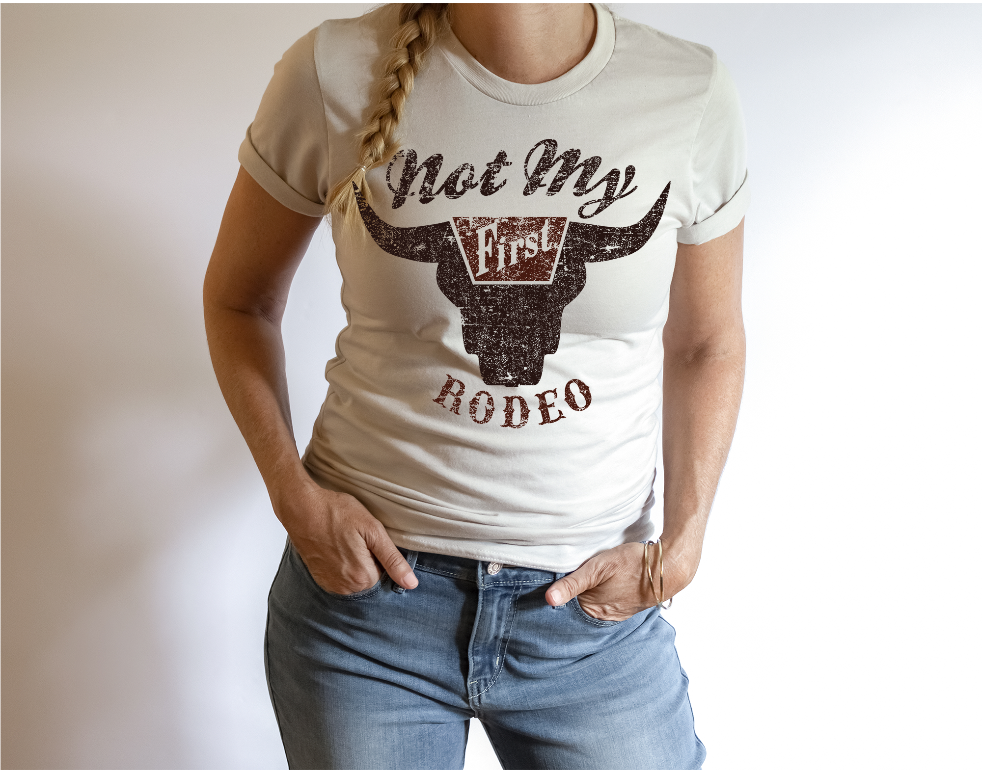 Crafted with care, this t-shirt features a bold and eye-catching design. The phrase "Not My First Rodeo" is displayed in a stylish and distinctive font, accentuated by a playful rodeo-inspired graphic. The design captures the spirit of resilience, showcasing your ability to handle any situation with ease.