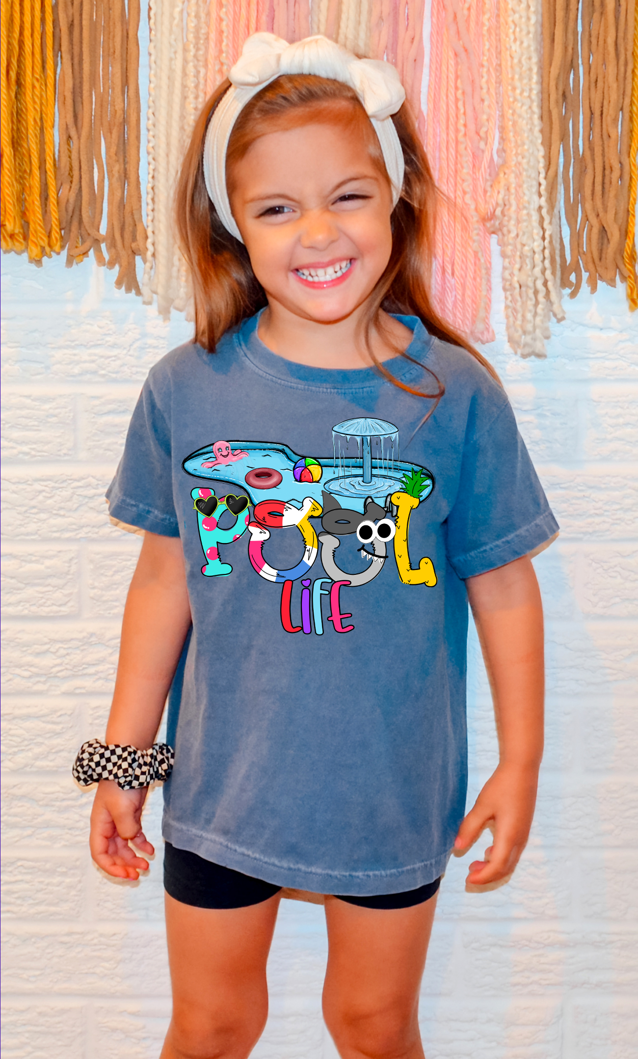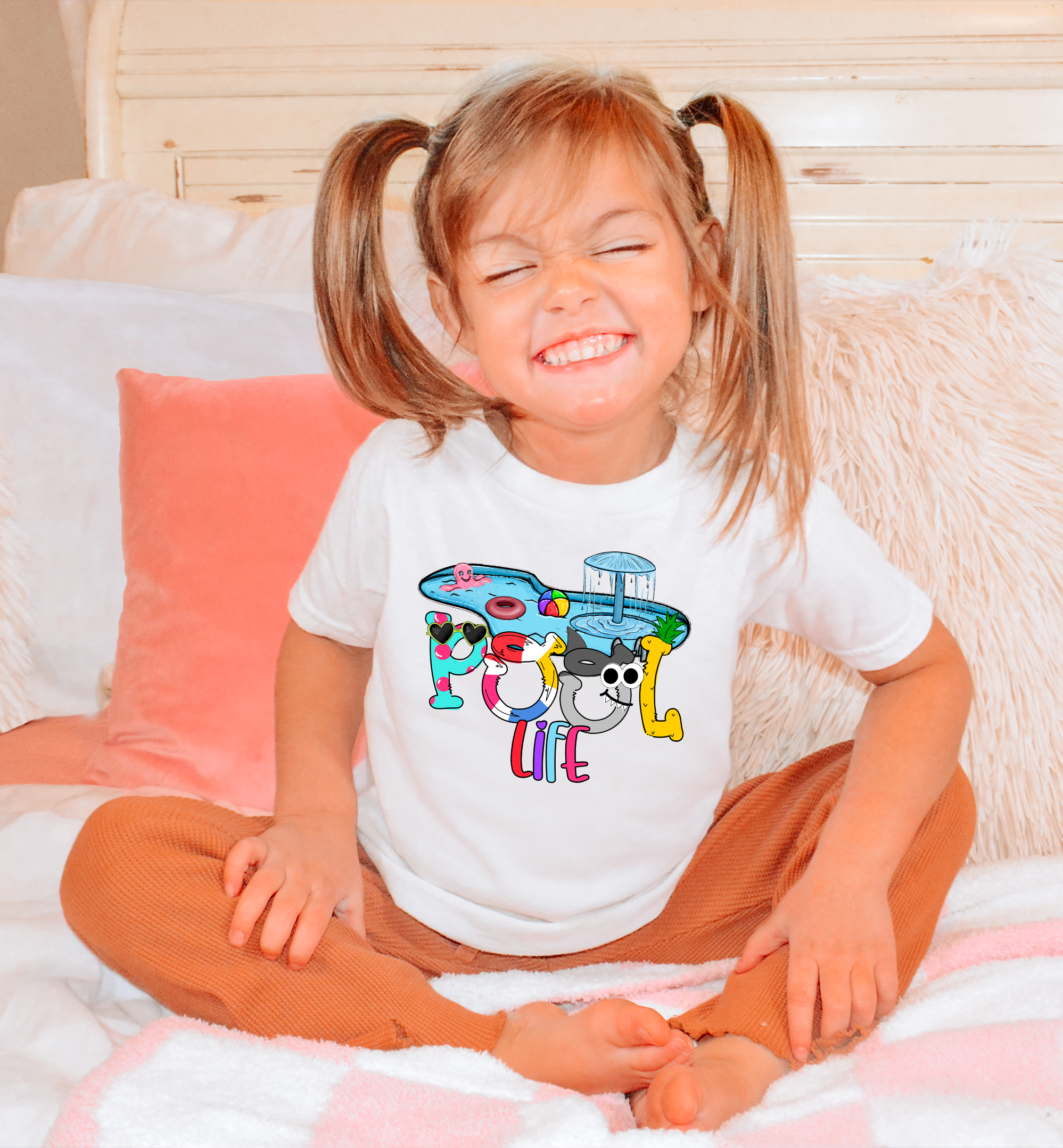 Let your child dive into the fun and vibrant world of pool life with this delightful and playful "Pool Life" kids shirt.