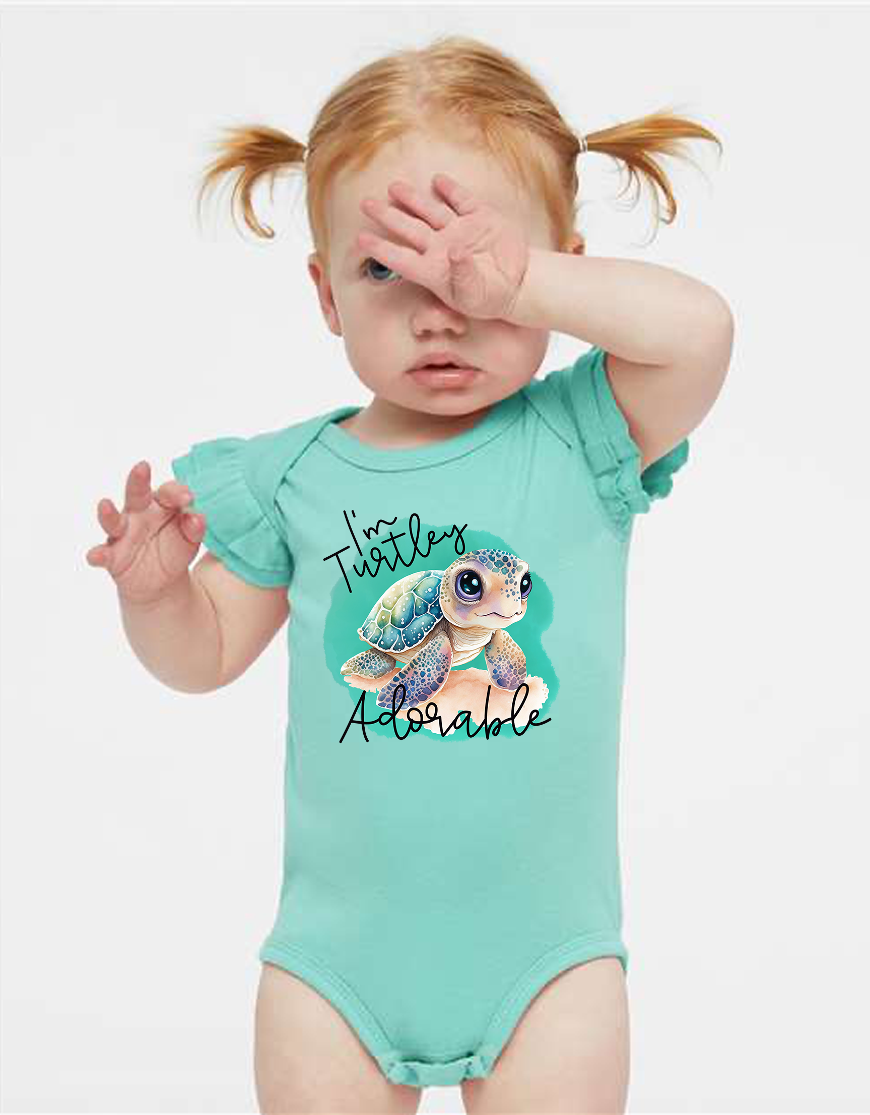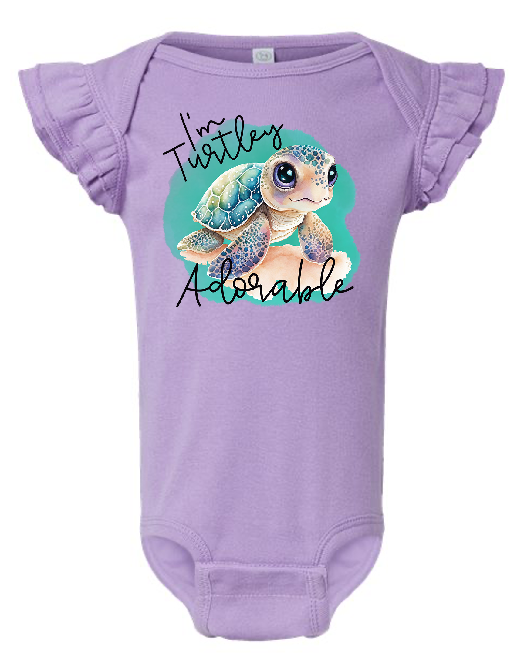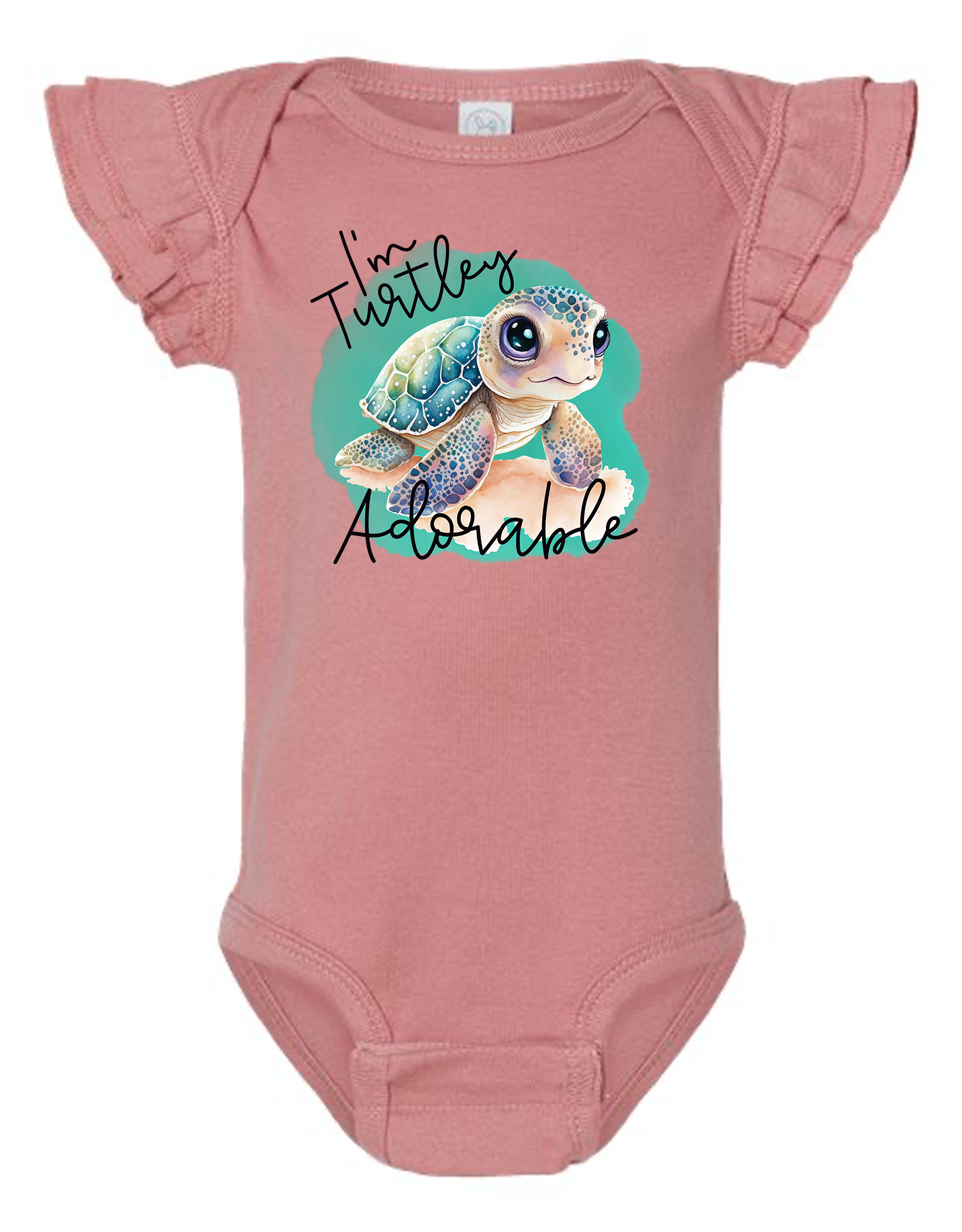 The front of the onesie features a delightful illustration of a turtle, known for its slow and steady nature. The design captures the turtle's adorable and lovable characteristics, showcasing its cute shell, flippers, and friendly face. Accompanying the illustration is the phrase "Turtley Adorable" written in a playful and whimsical font, adding a touch of sweetness to the outfit.