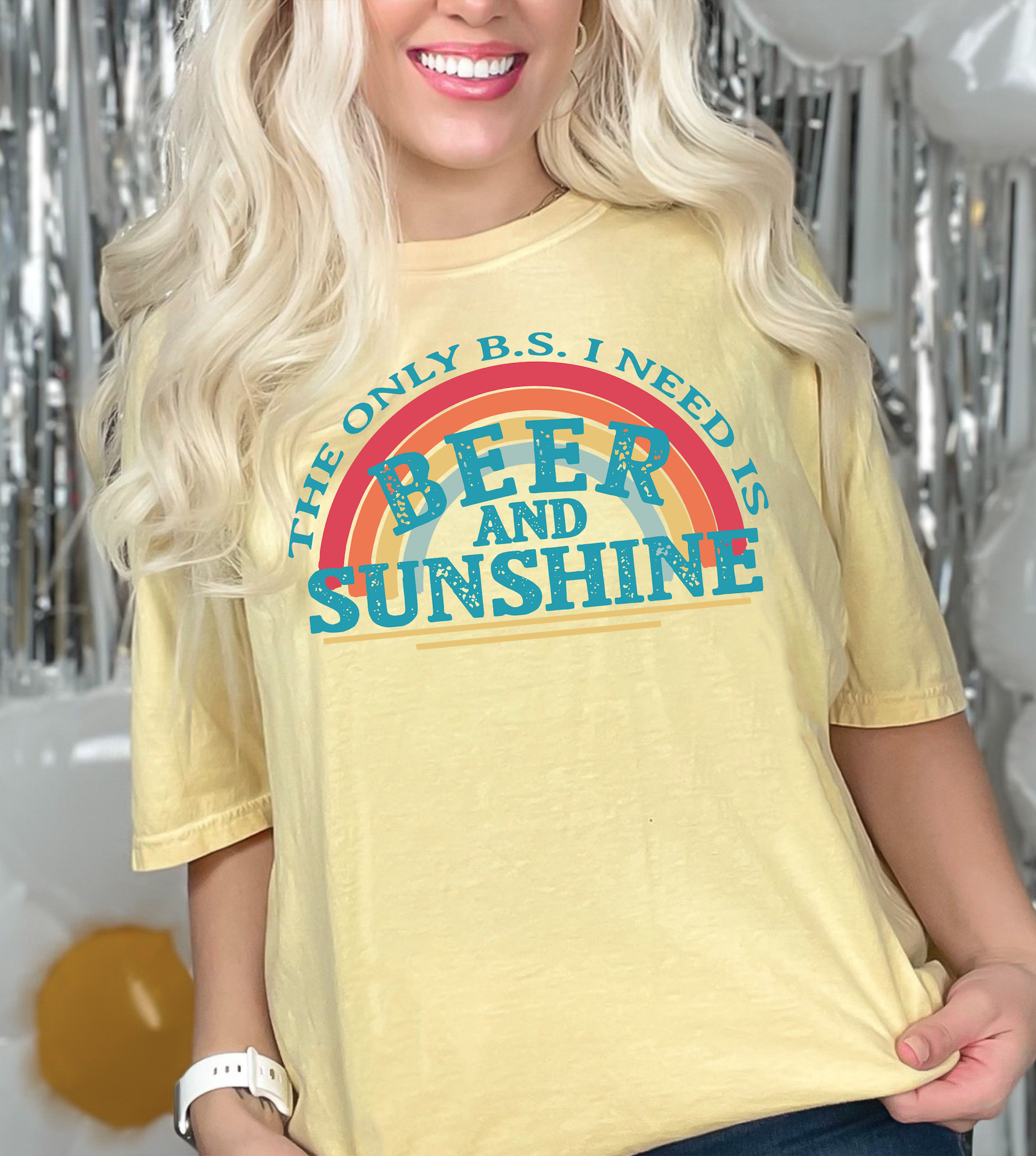 With a playful and eye-catching design, this shirt showcases the phrase "Beer and Sunshine is the only B.S. I need" in a rainbow-colored font that exudes happiness and optimism. The bold and vibrant colors symbolize the joy and positivity that come from embracing life's simple pleasures.